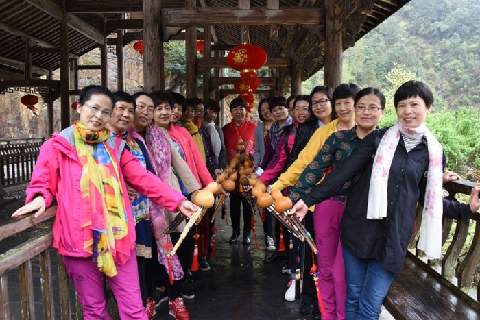 ??? 雨天出行,讓我們見(jiàn)識(shí)了七里的別樣風(fēng)景:龍?zhí)镀俨嫉膲延^、石梁溪的一瀉千里、七里山脈的云霧繚繞……受美景的影響,會(huì)員們情不自禁地取出葫蘆絲,依著龍?zhí)独葮虼底嗥鹜疝D(zhuǎn)悠揚(yáng)的葫蘆絲樂(lè)曲。優(yōu)美的樂(lè)聲吸引了當(dāng)?shù)赜慰偷鸟v足圍觀,得到了大家的好評(píng)!