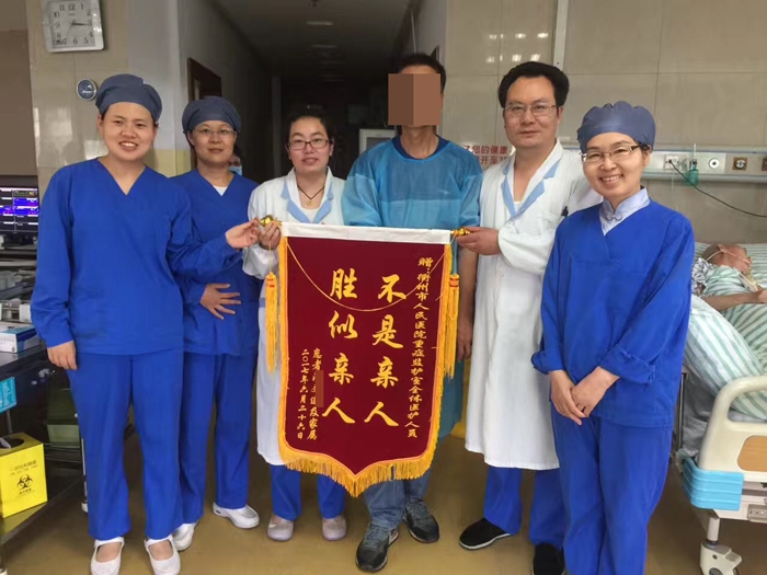 ??? 今年86歲的湯爺爺,因?yàn)槟X梗塞、帕金森綜合征、反復(fù)肺部感染、氣管切開(kāi)術(shù)后在急診重癥監(jiān)護(hù)室住院時(shí)間比較長(zhǎng),天天和他朝夕相處的醫(yī)護(hù)人員對(duì)待湯爺爺就像家人一樣,常常陪他聊天,把家里帶來(lái)的紅豆湯、水果喂給他吃。雖然湯爺爺不能開(kāi)口說(shuō)話,但他心里都明白,每當(dāng)湯爺爺偶爾露出甜甜的笑容,醫(yī)生和護(hù)士都特別開(kāi)心。