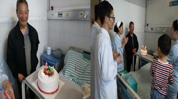 ??? 通過住院信息得知5月4日是老人的生日后,醫(yī)護人員便為老人送上了一碗熱騰騰的長壽面。老人吃著一碗再普通不過的面條,心里卻無比感動。老人覺得這碗面條讓他體會到了“家”的溫暖,更沒想到醫(yī)護人員把他當(dāng)成親人一樣。為了表示謝意,已經(jīng)因病多年不能吃甜食的老人特意到美妍蛋糕店買了一個蛋糕和大家一起分享,于是就出現(xiàn)了開頭的那一幕。