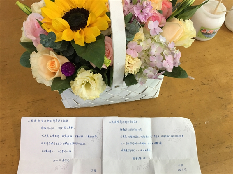 ??? 12月29日一大早,衢州市人民醫(yī)院腎內(nèi)科醫(yī)生李玉芳剛來到辦公室,就覺得眼前一亮:一籃子色彩清新的鮮花、兩封字跡娟秀的感謝信,讓這個(gè)寒日有了一絲春天的氣息。
