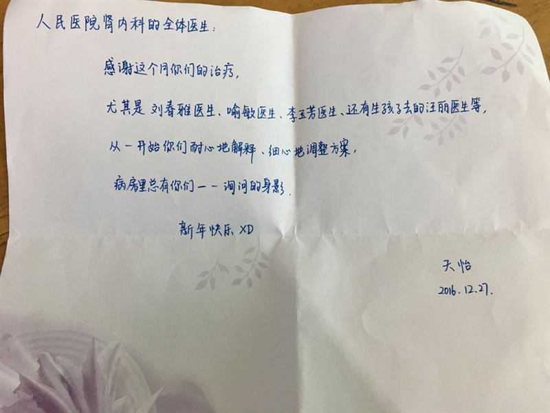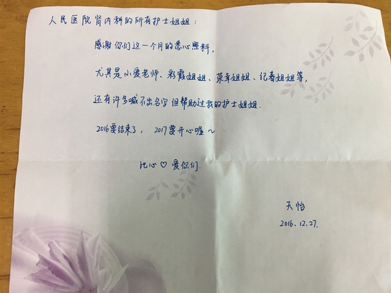 ??? 這不,天怡給醫(yī)生和護(hù)士們各寫了一封感謝信,把她叫得出來的醫(yī)護(hù)人員的名字一一羅列,感謝他們細(xì)心調(diào)整治療方案,以及一個(gè)月來的悉心照料,祝他們2017年過得開心!