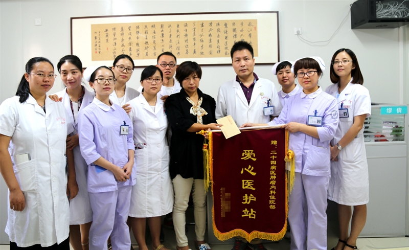??? 據(jù)悉,腫瘤內(nèi)科已多次為貧困患者組織募捐,去年12月,科主任鄭勤紅及護(hù)士長張小芳組織科室醫(yī)務(wù)人員在為癌癥患者謝冬蓮舉行愛心義賣臍橙,籌集愛心款四萬多元。通過愛心傳遞,讓社會更多愛心人士參與進(jìn)來,一起幫助這些貧困患者度過難關(guān);同時(shí)也鼓勵患者積極與病魔作斗爭,增加他們抗癌的信心。一直以來,腫瘤內(nèi)科醫(yī)護(hù)人員將“恪盡職守,善待病人”的服務(wù)理念轉(zhuǎn)化為“四心”活動,即熱心助人、細(xì)心查房、耐心問診、貼心服務(wù),受到了患者及家屬一致好評!