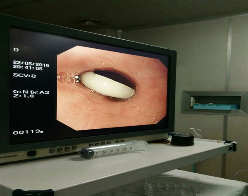 ??? 為避免取出過(guò)程中棋子脫落掉入氣道引起窒息,取出術(shù)需在全麻下進(jìn)行,手術(shù)室、麻醉科、內(nèi)鏡中心一切準(zhǔn)備就緒。術(shù)中發(fā)現(xiàn)圍棋子正好卡在食管中下段,因?yàn)槠遄颖砻婀饣?,使用異物鉗未能成功,換用網(wǎng)籃,在收緊時(shí)也多次滑脫。