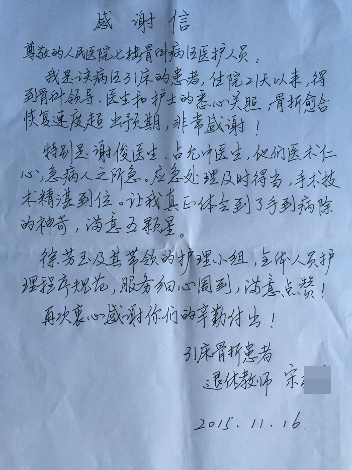 于細微處見真情,患者遞上表揚信