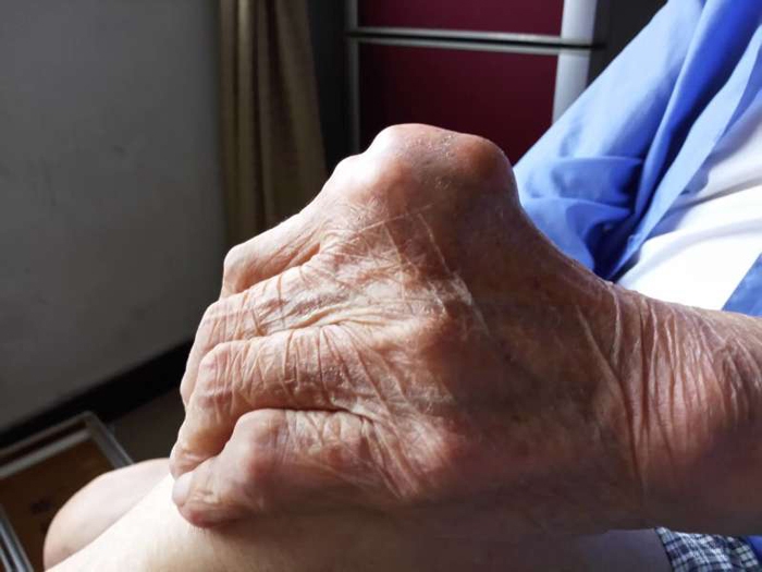 他斜坐在輪椅上,腦袋耷拉著,沒有半點精神,僅剩無力的呻吟和痛苦的表情。在衢州市人民醫(yī)院內(nèi)分泌科住院治療的張大爺全身瘦弱,雙手手臂散在著青紫斑塊,關(guān)節(jié)處沉積的痛風石已有草莓般大小,嚴重影響手指關(guān)節(jié)的活動。右足趾明顯腫脹且腳趾已經(jīng)破潰出血、流膿,依稀可見排出的痛風石,并伴有陣陣惡臭。只要稍微觸碰,就疼得撕心裂肺。