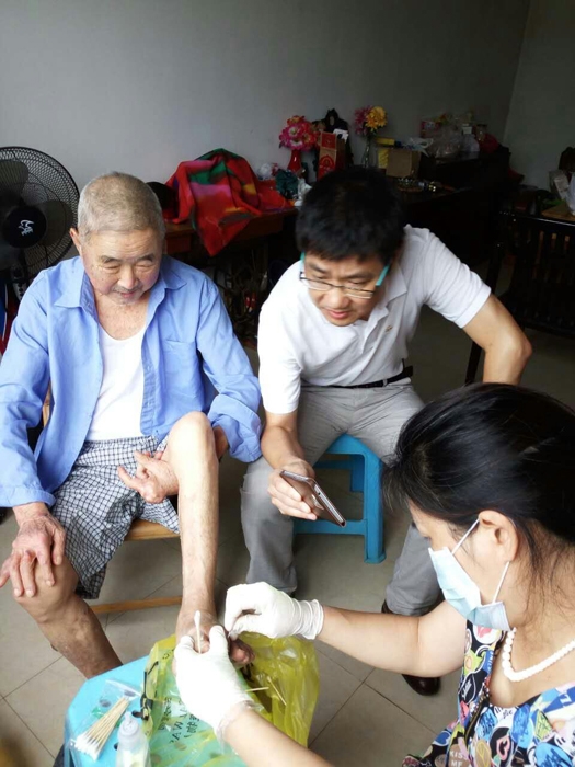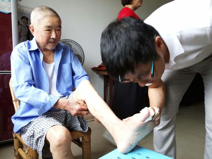 一進門,房間里充斥著一股異味,張大爺平躺在床上,看見住院期間照料自己的醫(yī)護人員,老人立馬坐起,開心極了。胡朝暉檢查了張大爺?shù)淖惚硠用},發(fā)現(xiàn)雙腳水腫比較明顯,腳趾有輕微的發(fā)黑并有破潰;雙手的痛風石雖沒有破潰,但仍影響關(guān)節(jié)活動。陳育群護士長麻利地完成了清創(chuàng)換藥處理。