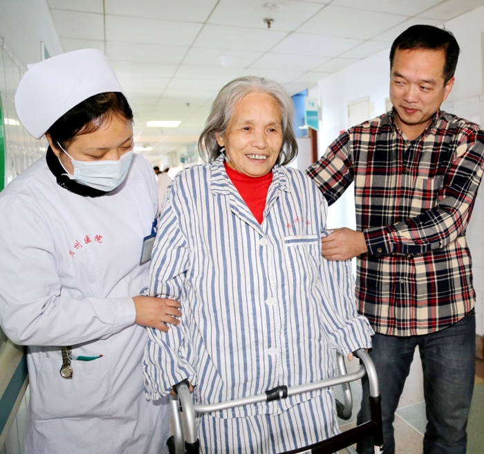 ?在骨科病房,髖關(guān)節(jié)置換術(shù)后的老人在護(hù)士和兒子的陪伴下終于第一次下床行走。