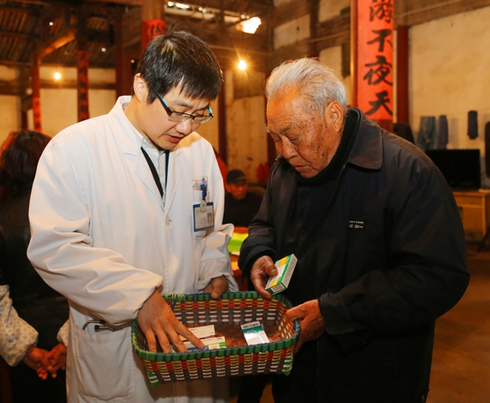 一位村民拿著一籃子藥向內(nèi)分泌代謝病科胡朝暉主任咨詢?nèi)绾斡盟?/P>