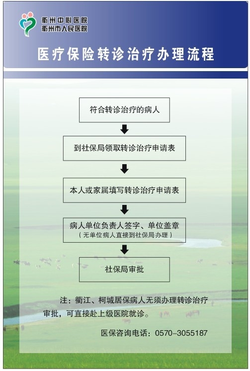 醫(yī)療保險(xiǎn)轉(zhuǎn)診治療辦理流程 文章來源:醫(yī)保辦 作者:醫(yī)保辦 點(diǎn)擊數(shù):15021 更新時(shí)間:2012-09-11 上一篇: 衢州市衢江區(qū)人民政府辦公室關(guān)于完善城鄉(xiāng)居民基本醫(yī)療保險(xiǎn)管理辦法的通知 下一篇: 最多跑一次”又升級!28種大病保險(xiǎn)特殊用藥,在衢州這些藥店可刷卡結(jié)算