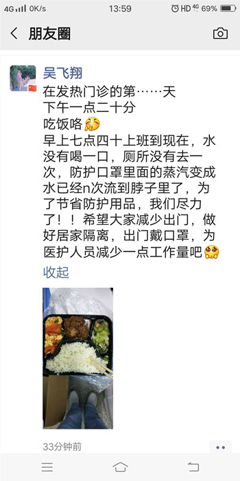 詢(xún)問(wèn)病史、測(cè)量體溫、造冊(cè)登記……這些在平常看來(lái)再普通不過(guò)的工作,此時(shí),因?yàn)橐咔槎鴱?qiáng)度倍增,從早上7:40持續(xù)工作到下午1:20,整整忙碌了近5個(gè)小時(shí)才吃上午飯,期間,沒(méi)時(shí)間喝水、沒(méi)時(shí)間上洗手間,防護(hù)口罩里的水蒸氣凝結(jié)成水滴,N次流到脖子里也顧不上換, 短短10分鐘的午飯時(shí)間,之后,又馬上投入工作。