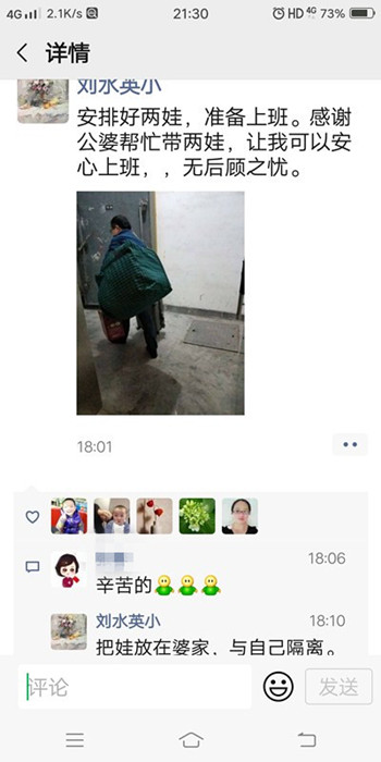 劉水英,發(fā)熱門(mén)診常駐護(hù)士,看到這個(gè)背影,有點(diǎn)心酸。照片上背行李的是劉水英的丈夫,為了妻子能安心工作,無(wú)后顧之憂(yōu),他把孩子的行囊背到爺爺奶奶家。