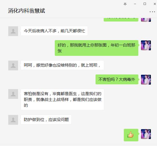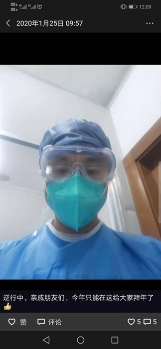 翁慧斌,消化內(nèi)科副主任醫(yī)師,1月19日選派到發(fā)熱門(mén)診坐診,這是他在年初一時(shí)留下的一張自拍,小編采訪問(wèn):怕嗎?他說(shuō),“害怕倒是沒(méi)有,畢竟是醫(yī)生,這是我們的職責(zé),就像戰(zhàn)士要上戰(zhàn)場(chǎng)樣,都是我們應(yīng)該做的。”