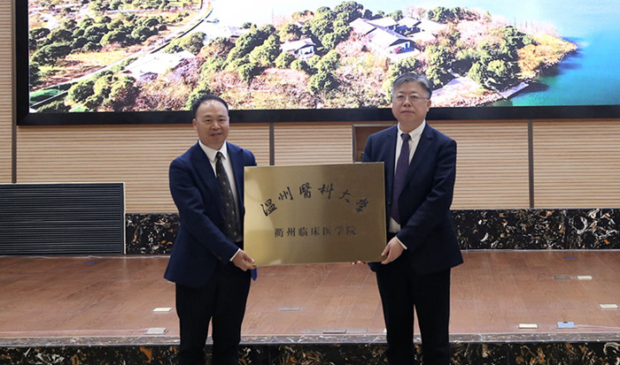 中國工程院院士、溫州醫(yī)科大學(xué)校長李校堃為溫州醫(yī)科大學(xué)附屬衢州醫(yī)院院長葉金林授牌:溫州醫(yī)科大學(xué)衢州臨床醫(yī)學(xué)院