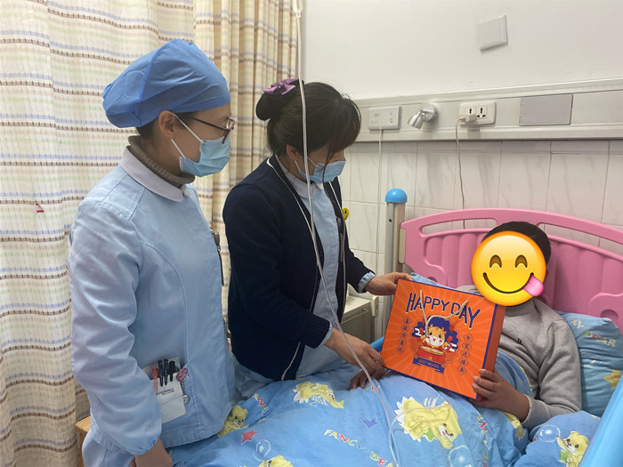 護(hù)士長(zhǎng)汪詠梅協(xié)同責(zé)任護(hù)士為孩子送新年禮物
