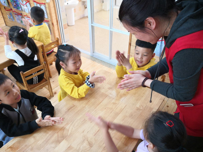 通過簡短有趣的口訣向小朋友們示范標(biāo)準(zhǔn)的“七步洗手法”,小朋友們開心極了。