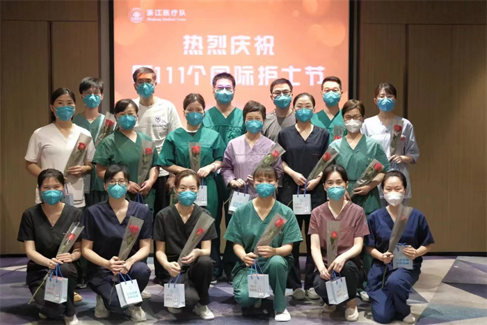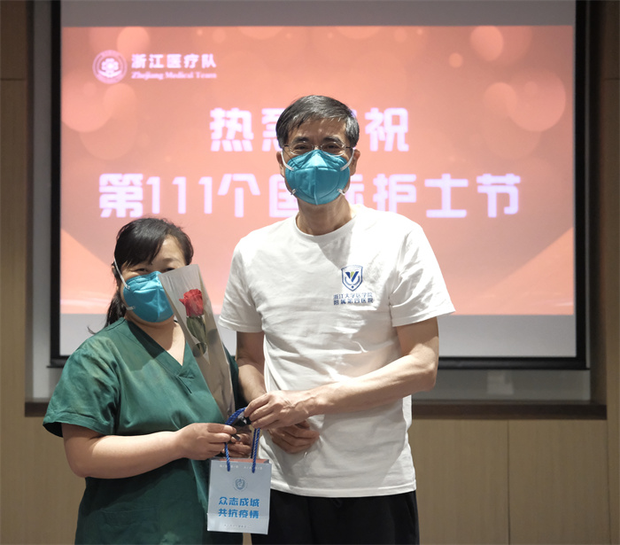 5月9日晚,在第111個(gè)國(guó)際護(hù)士節(jié)即將到來(lái)之際,浙江省衛(wèi)健委副主任葛明華與浙江省援滬方艙醫(yī)院醫(yī)療隊(duì)的護(hù)士們共度護(hù)士節(jié),代表省衛(wèi)健委為護(hù)士們送上鮮花和禮物。衢州市人民醫(yī)院(溫州醫(yī)科大學(xué)附屬衢州醫(yī)院)骨科護(hù)士長(zhǎng)張翠琴,作為衢州援滬醫(yī)療隊(duì)護(hù)士代表,和來(lái)自省級(jí)醫(yī)院的護(hù)士代表一起參加慰問(wèn)。
