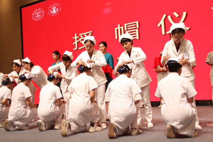 活動現(xiàn)場,溫州醫(yī)科大學(xué)護理學(xué)院見習(xí)生授帽儀式舉行,將護理事業(yè)的使命與責(zé)任代代相傳。護理前輩李衛(wèi)華老師分享從醫(yī)感悟,青年護士手捧鮮花致敬傳承。