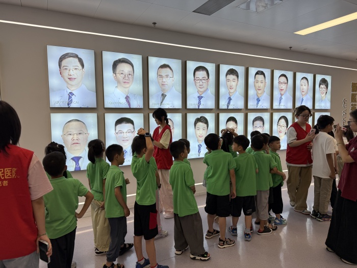 開營首日的“職場探秘”成了孩子們最期待的活動。在老師們的引導(dǎo)下,萌娃牽著小手,排著整齊的隊伍穿行于院區(qū)。走進(jìn)人才學(xué)科長廊,墻上展示的“醫(yī)學(xué)超人”瞬間抓住了孩子們的目光,有的不禁歡呼道:“這是我媽媽!”。
