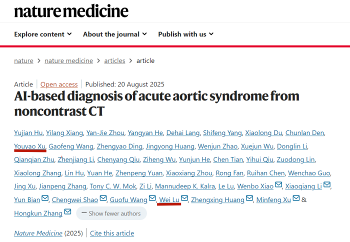 日前,全球頂尖醫(yī)學(xué)期刊《Nature Medicine》在線發(fā)表了一項關(guān)于急性主動脈綜合征(AAS)人工智能診斷的重要研究成果——《AI-based diagnosis of acute aortic syndrome from noncontrast CT》。我院血管外科作為核心參與單位之一,黨委委員、副院長陸煒作為共同通訊作者,為本研究提供了重要臨床數(shù)據(jù)與技術(shù)支持。